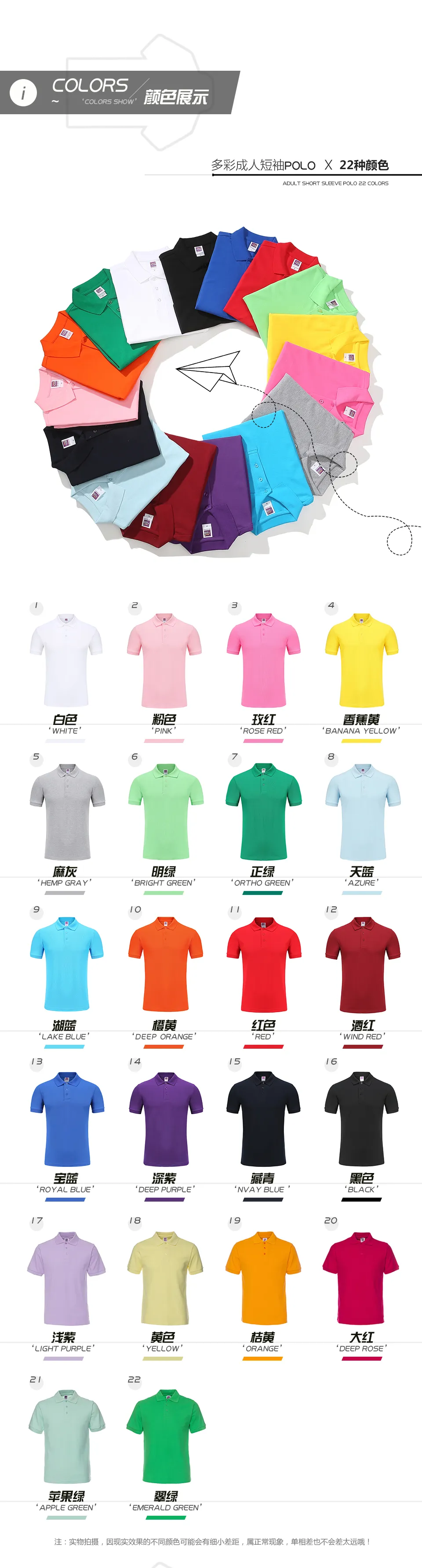 01白色, 007黑色, 025玫紅, 026深玫紅, 032酒紅, 035粉色, 014麻灰, 060明綠, 064正綠, 065翠綠, 066蘋果綠, 044黃, 047橙黃, 048桔黃, 049香蕉黃, 080淺紫, 082深紫, 091天藍, 092湖藍, 094寶藍, 099藏青深藍, 030大紅