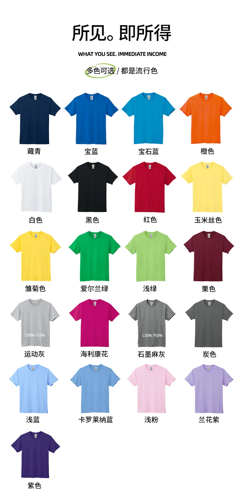 藏青32C, 寶藍51C, 寶石藍26C, 橙37C, 白30N, 黑36C, 紅40C, 雛菊98C, 愛爾蘭綠167C, 淺綠12C, 栗色83C, 運動灰95H, 海利康花10C, 石墨麻灰516H, 炭色42C, 淺藍69C, 卡羅萊納藍109C, 淺粉20C, 蘭花紫191C, 紫81C