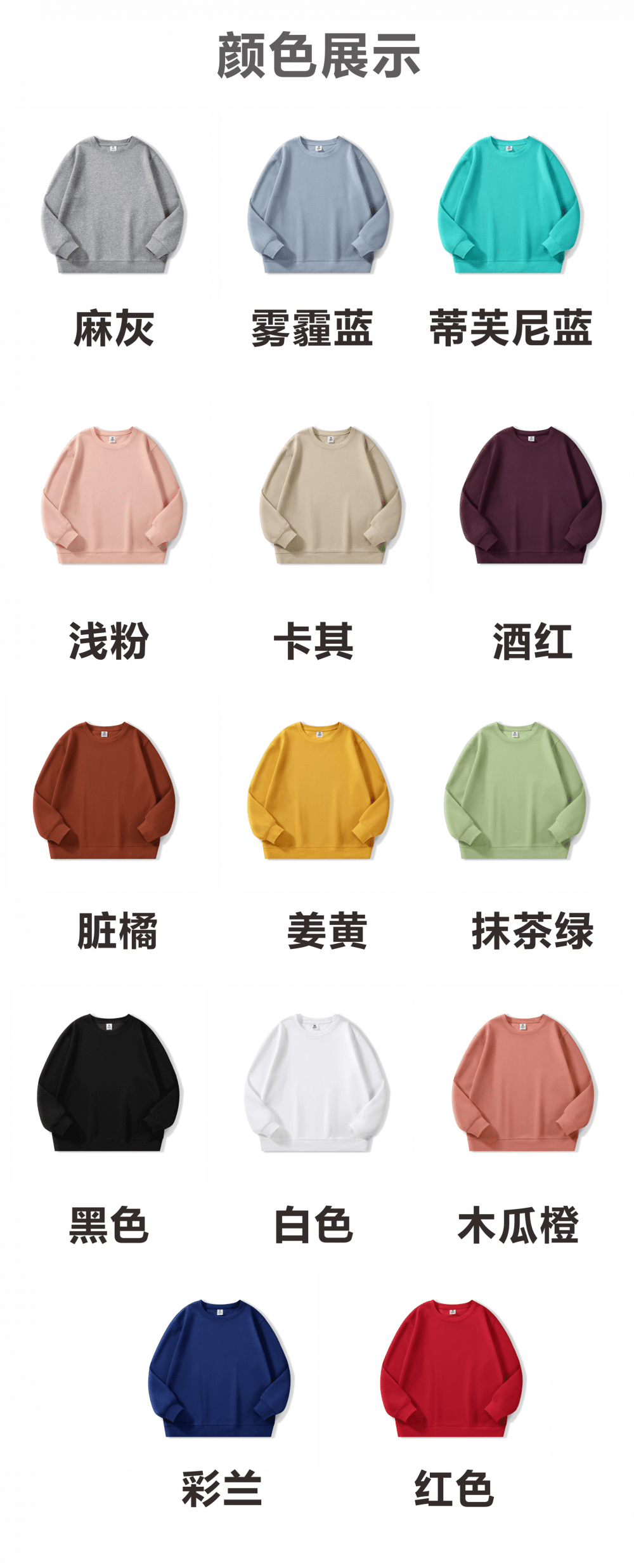 卡其, 姜黃, 彩藍, 抺茶綠, 木瓜橙, 深橙, 淺粉, 白色, 紅色, 蒂芙尼藍, 酒紅, 霧霾藍, 麻灰色, 黑色