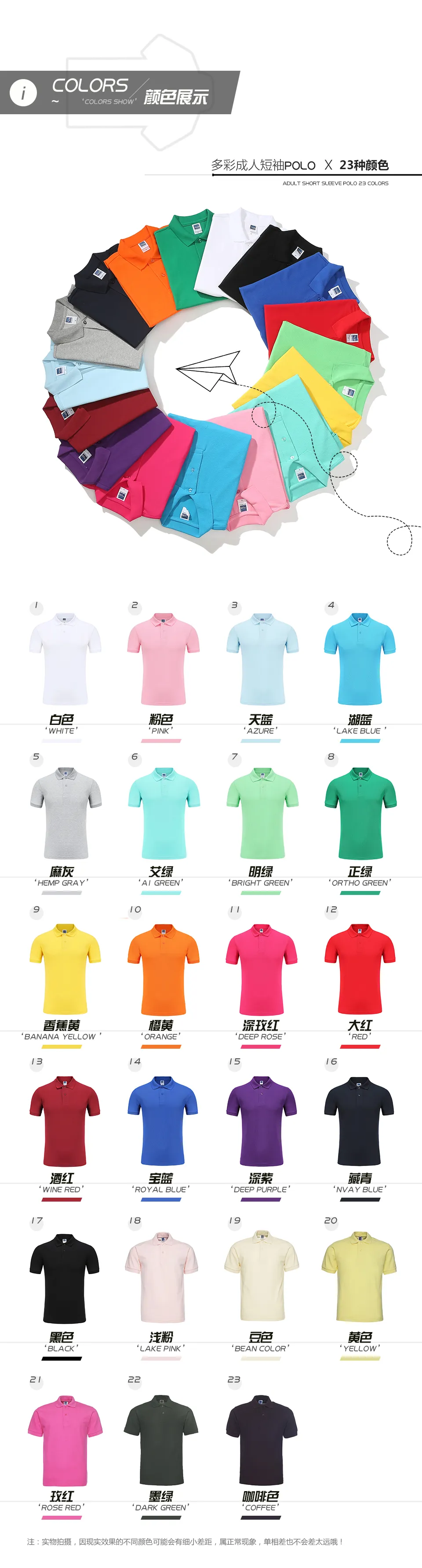 01白色, 007黑色, 025玫紅, 026深玫紅, 032酒紅, 035粉色, 014麻灰, 060明綠, 064正綠, 067墨綠, 070艾綠, 044黃, 047橙黃, 049香蕉黃, 082深紫, 091天藍, 092湖藍, 094寶藍, 099藏青深藍, 100豆色, 103咖啡, 030大紅